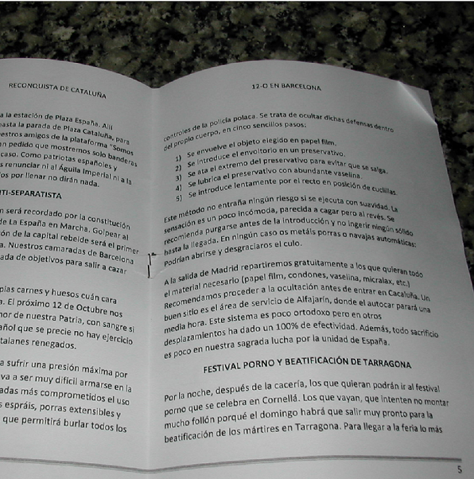 – Mucho ruido y pocos nazis en el 12 de octubre. Los medios lo pintaron como algo cercano al apocalipsis en Barcelona, con hordas de autobuses cargados de neonazis con armas introducidas en sus rectos para salir de cacería. La verdad, no se vio nada del otro jueves por las calles. Aun así, los medios que sí, que todo neonazis. ME ABURRO.